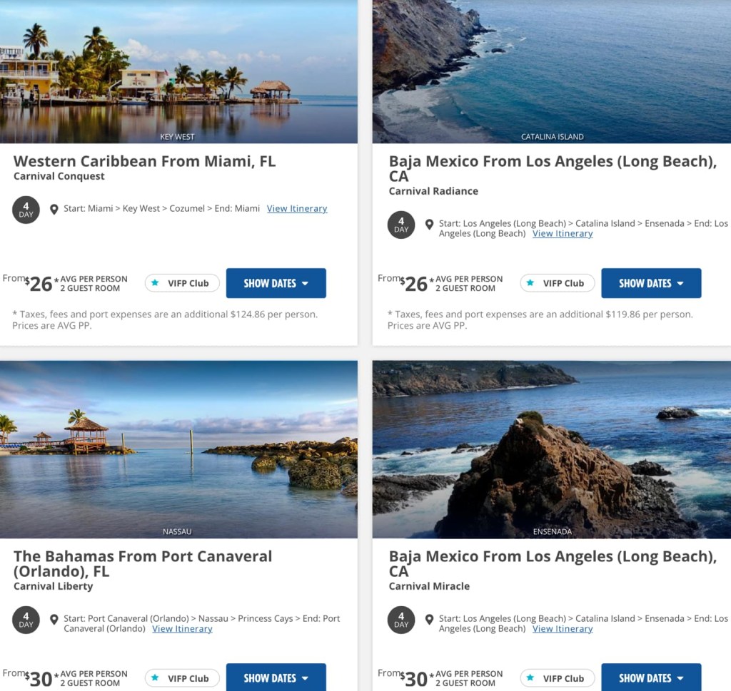 So, what would you actually end up paying for that $26 cruise? Well, assuming two people are going, if you keep the basic interior cabin, you’re paying $150.86 per person. For four days. Meals and Entertainment included. Alright… that’s still freaking amazing. That’s $38 a day — I can’t stay home for that! That’s…. kinda ridiculous. Ok, so how does one get these deals? Stay tuned…