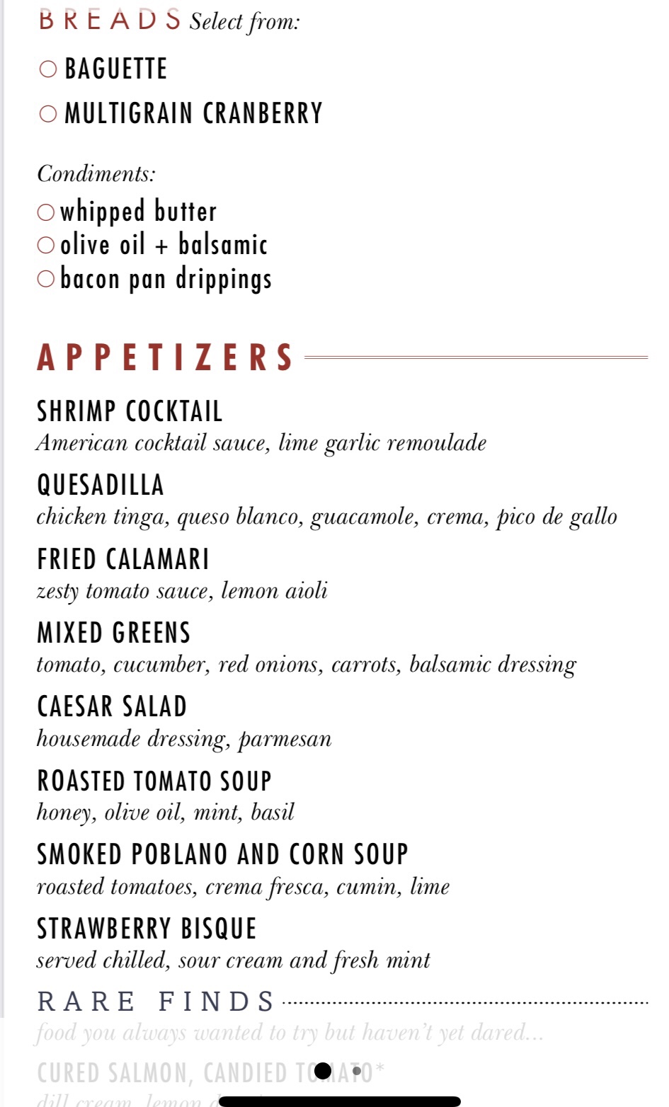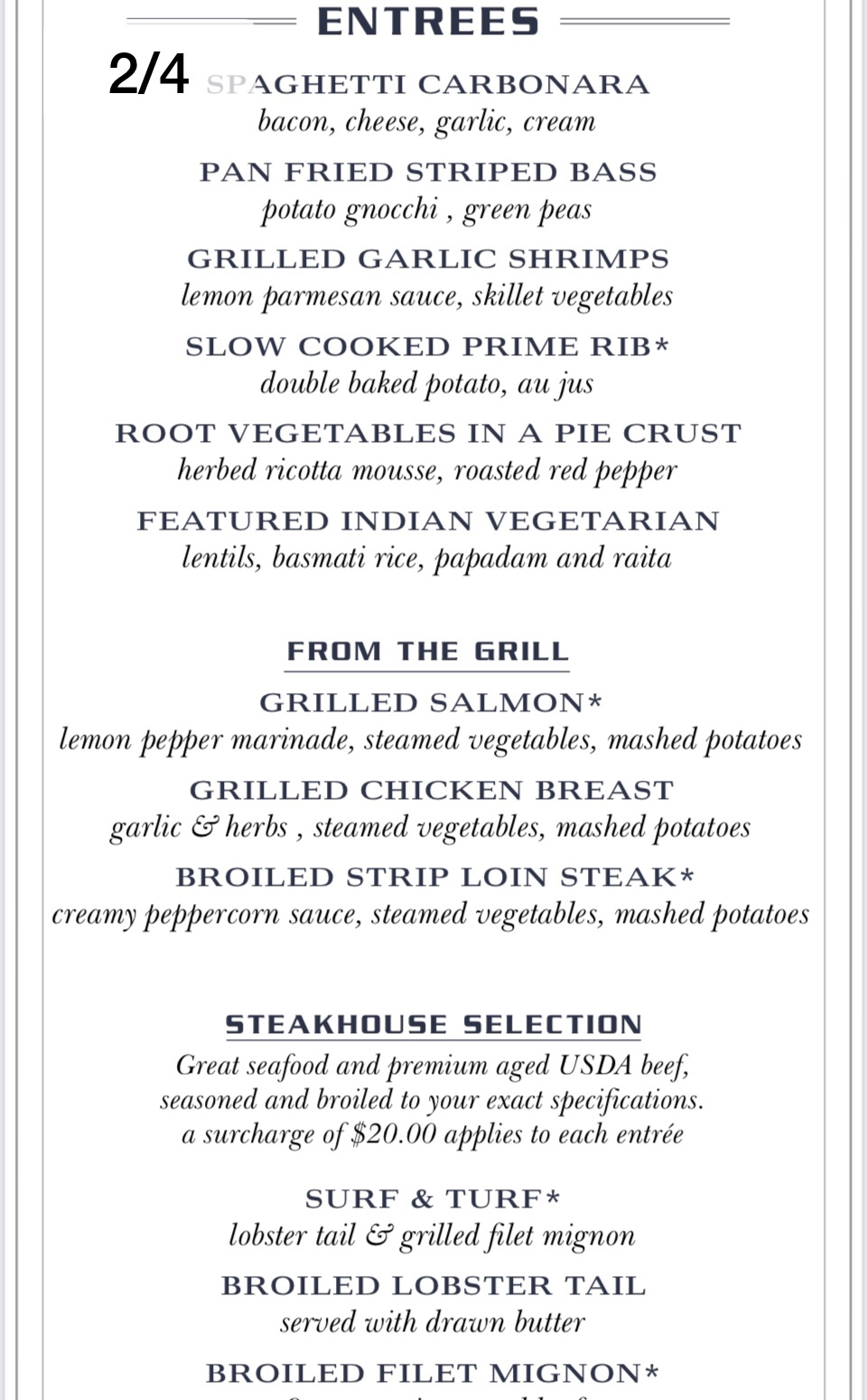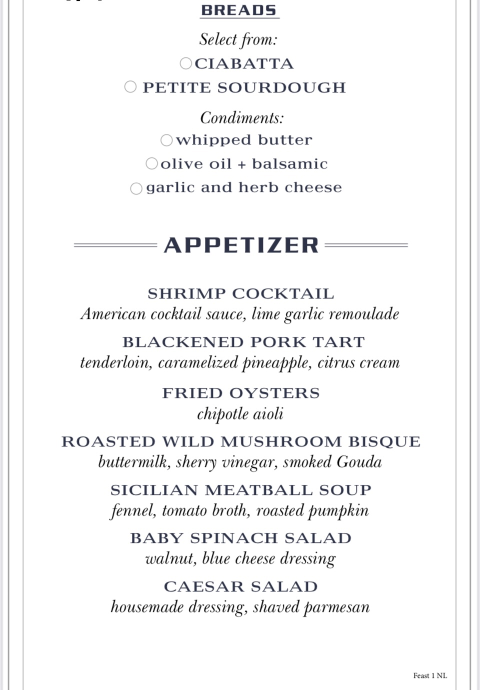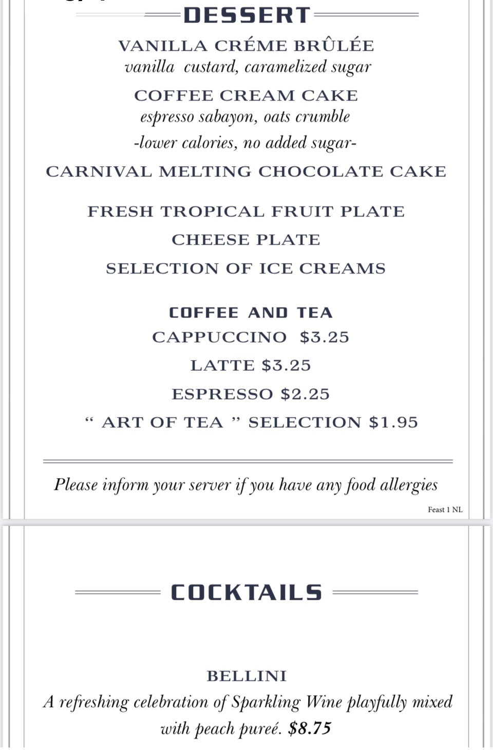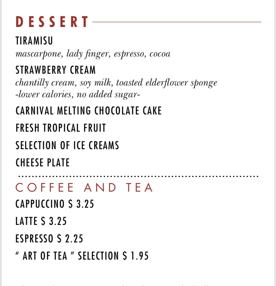 So, true to form, I lost track of which night’s menu was for which night of the cruise. So let’s just group them into appetizers, mains and desserts, shall we?