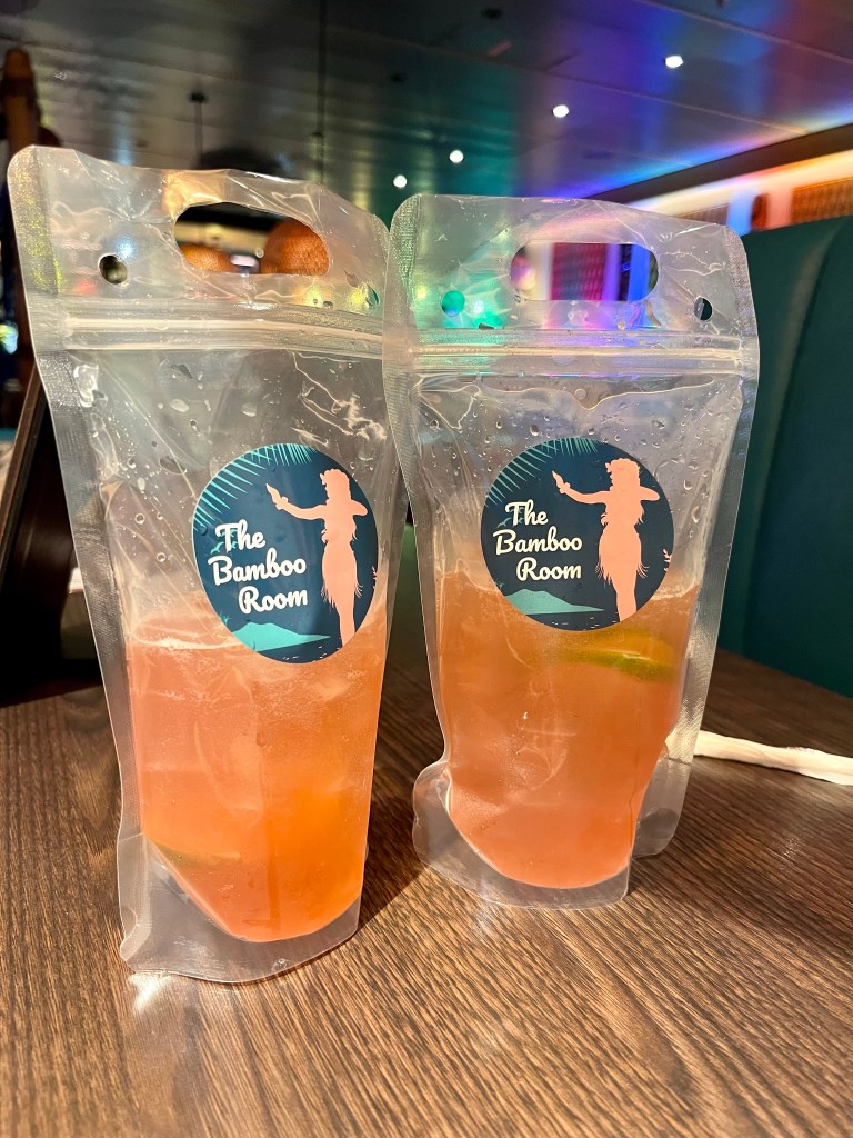 Some things to keep in mind: Carnival’s drink package is NOT unlimited. You are actually cut off at 15 drinks per day (and I’ve known many to try to challenge and surpass that lofty number). The drink package may or may NOT work on the CL’s private island. Drinks are only included up to a certain dollar amount. For example, at the time of cruising, these Bamboo Room drinks were $17 each — the drink package only covers $15 drinks and lower. You’ll be charged the difference.